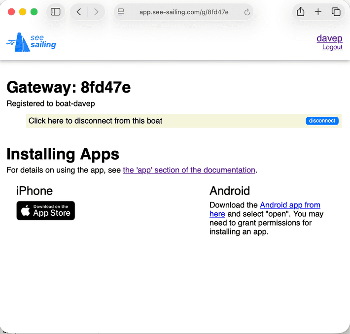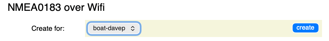 To connect your phone to your account we need to register your WiFi gateway in See Sailing itself. A virtual gateway, if you will. To start the process, scroll to the bottom of your user page to see a section called "NMEA0183 over WiFi". Use this form to create a gateway ID and associate it with your boat ... like this: