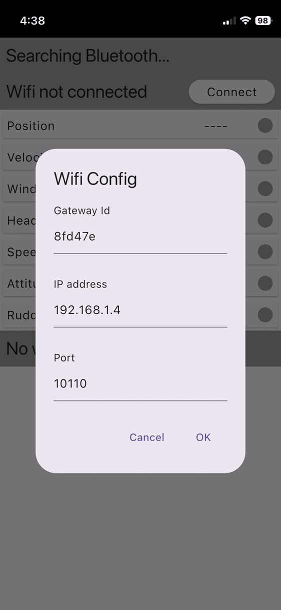 To configure WiFi: first connect to the correct WiFi access point; start the See Sailing app; and where it says "WiFi not connected", press the "connect" button. You should see a screen like this: