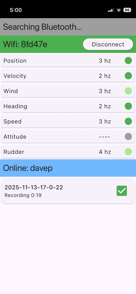 The eventual "pattern" is the same as for Bluetooth: Data streams onto your phone and is uploaded to the cloud when you're ready. We're unable to record attitude data since it is not supported in NMEA 0183; and the (time) resolution of the uploaded data will be lower, although you will still get good results.